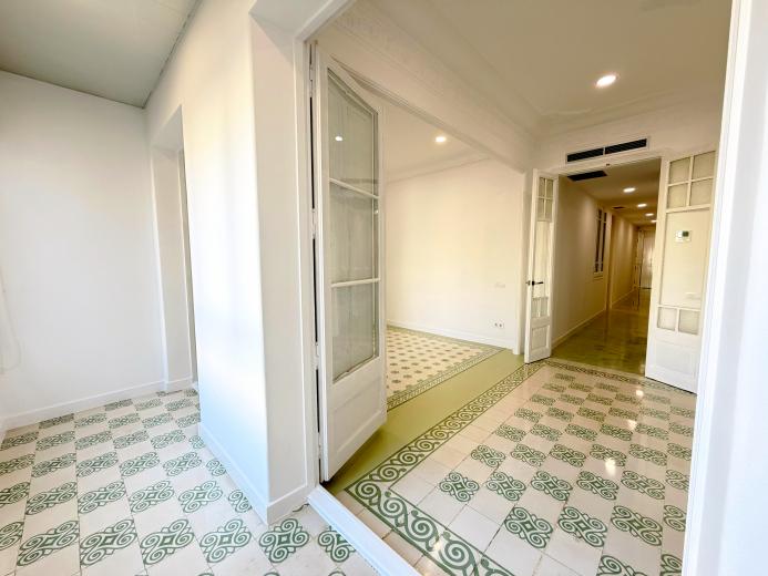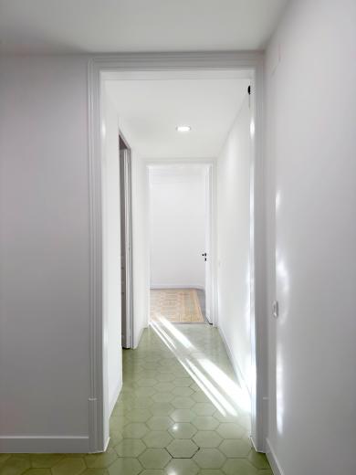 Vivienda de 135m2 en Barcelona situada en finca regia, en la que el edificio en el cual se encuentra cuenta con un estilo arquitectónico clásico que refleja la belleza y elegancia de la zona. Al entrar en el piso, encontramos un espacioso recibidor que conduce a todas las áreas de la vivienda.