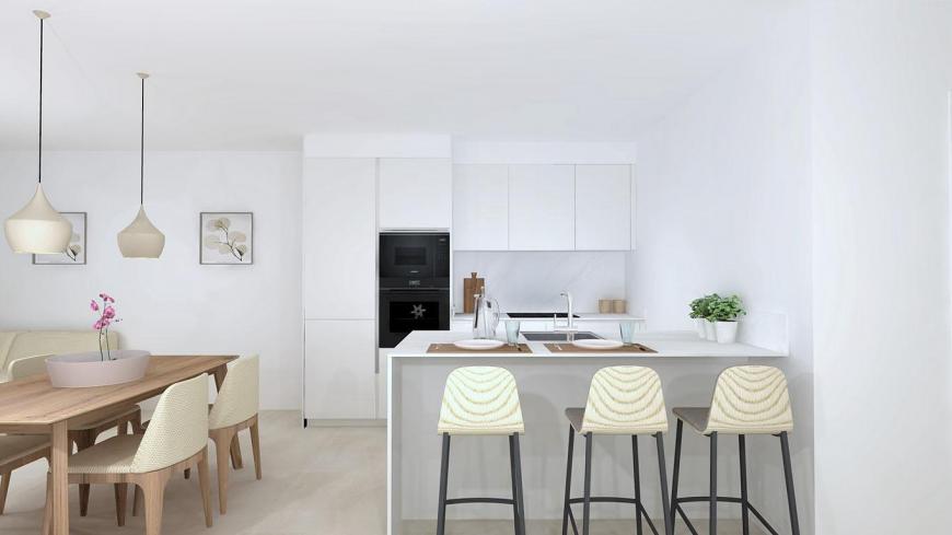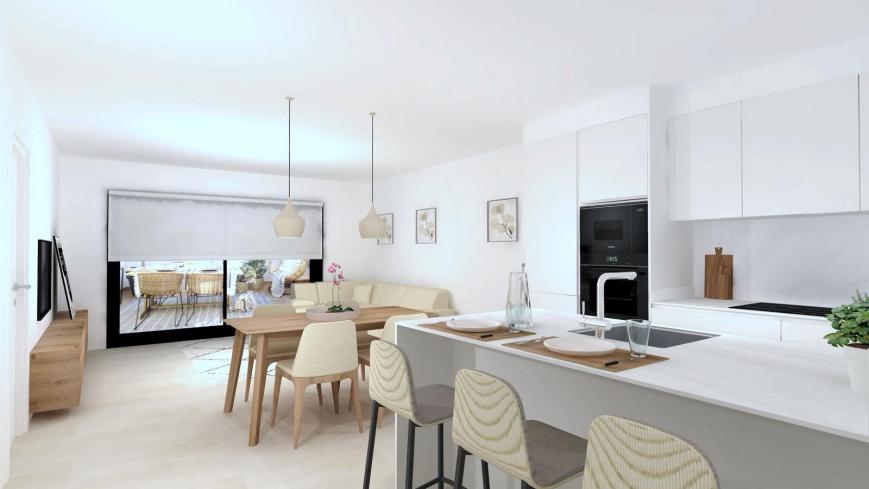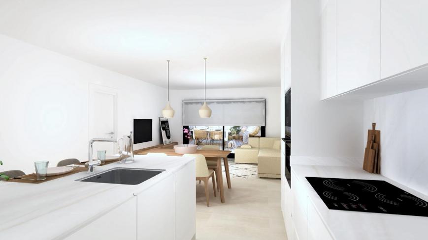 La zona de día destaca por un luminoso salón-comedor de 30 m² y una cocina abierta SANTOS, completamente equipada y acabada con encimera Dekton.